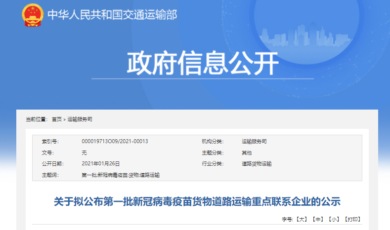 为推动新冠病毒疫苗货物运输供需对接,日前,交通运输部组织有关行业协会和新冠病毒疫苗研发生产企业,遴选了28家道路运输企业,拟作为第一批新冠病毒疫苗货物道路运输重点联系企业,现予以公示。公示期限为2021年1月26日至2021年2月2日。名单如下... ...