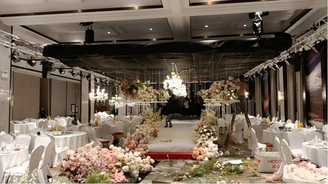石老板是湖南怀化人,从业20多年里,他亲身体会到人们对婚礼现场布置需求的变化,他说现在的婚礼布置普遍更加精致,灯光、音响、鲜花都要精挑细选,不同的场地布置的方式也不一样。比如室内通常是在酒店,布置相对容易一些,不过也要考虑到色彩的搭配、灯光的角度、音响的位置。有些酒店大厅里有承重墙,场景的设计就得更加用心,摄像角度才能合理。室外布置和天气的关系很大,要做好防风、防雨、防晒,架子的高度也要调整,鲜花的水分也要保持好。“结婚这件大事一生就一次,活肯定要做得精细一些。”