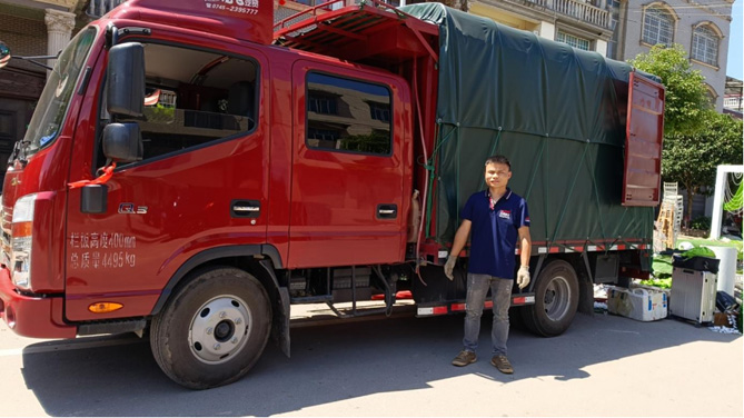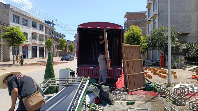 搭建需要用到的设备和道具比较多,一般的车装不下,石老板一直选择用轻卡来拉设备,市场上的几大主流品牌的车都买过。都用过一遍之后,他觉得还是帅铃比较趁手,今年4月份,他购买了现在这辆帅铃Q3双排车型,仓栅上装,还特地选了红色车漆,寓意生意红红火火。