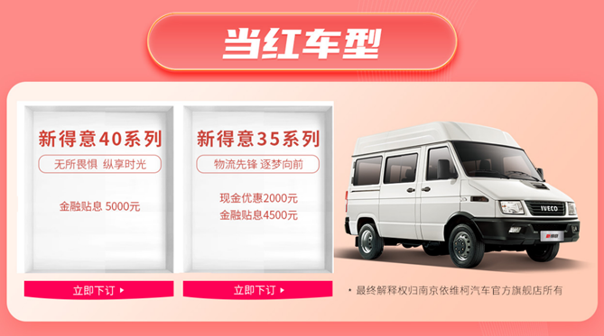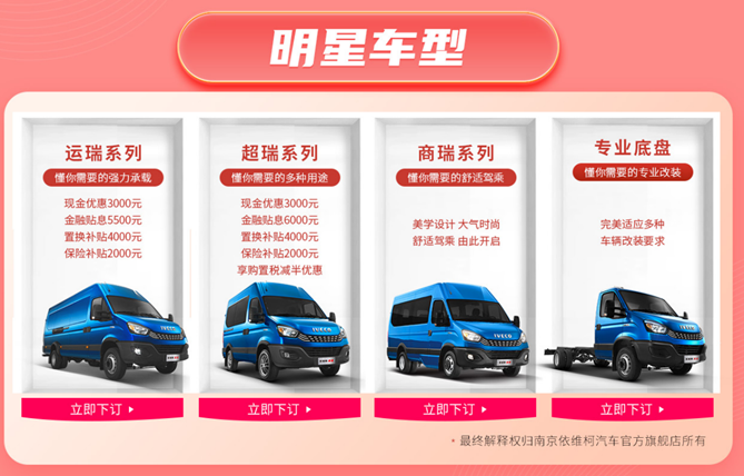 为感恩回馈广大用户的支持和信赖,本次618大促活动期间,南京依维柯不仅带来了多款受用户好评的明星车型,更是“想用户所想”携现金礼、金融礼、置换礼、保险礼、购置税减半等多重超惠福利重磅出击。以依维柯新得意厢货产品V35为例,厂商指导价为10.79万的蓝牌大VAN,现在只需8.99万,就能开回家。购买依维柯欧胜V42-33S的用户,同样可尊享最高达20500元的累计综合优惠!