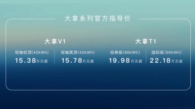 全新品牌已来,全新平台也应运而生。上汽大通MAXUS“全球纯电智慧轻型车架构平台”MILA,将成为品牌开启高品质新能源轻型车市场的问路之“玉”。面向全球市场和未来趋势,上汽大通MAXUS基于该平台打造的首款车型大拿V1、大拿T1同步震撼上市,以划时代的“全维度创新”产品力刷新全球新能源轻型车“天花板”。大拿V1售价15.38万元起;大拿T1售价19.98万元起。双车齐发,上汽大通MAXUS“大拿”助力用户成为“面子大拿”和“赚钱大拿”、“省心大拿”和“财富大拿”。
