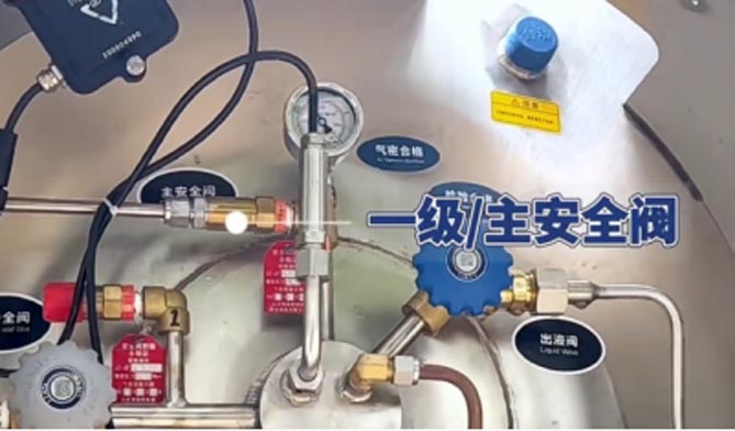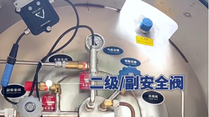 务必佩戴手套操作气瓶上的出液阀、增压阀、放空阀,避免低温冻伤。顺时针旋转为关闭阀门,逆时针旋转为开启阀门。开启阀门到最大角度时,建议回转10-20度,以避免低温结冰冻住阀芯。如果阀门被冻住,也不要用锤子和撬棍敲击,应该用温水持续浇注,融化冰霜后再对阀门进行操作。
