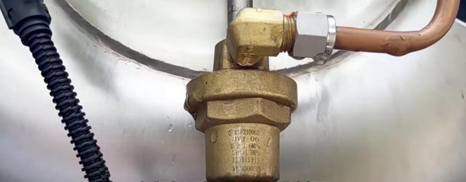 下部是经济阀,气瓶出厂时的压力已经设定好了,一般如果说气瓶的压力高于经济阀设定的范围时,经济阀自动开启。此时,气瓶内上部的气体会经过经济阀,进入到出液阀的管路,供发动机所用,同时气瓶的压力得到及时降低。当气瓶的压力低于经济阀设定的范围值时,经济阀自动关闭,此时气瓶内的液化天然气经过出液阀继续给发动机供气。
