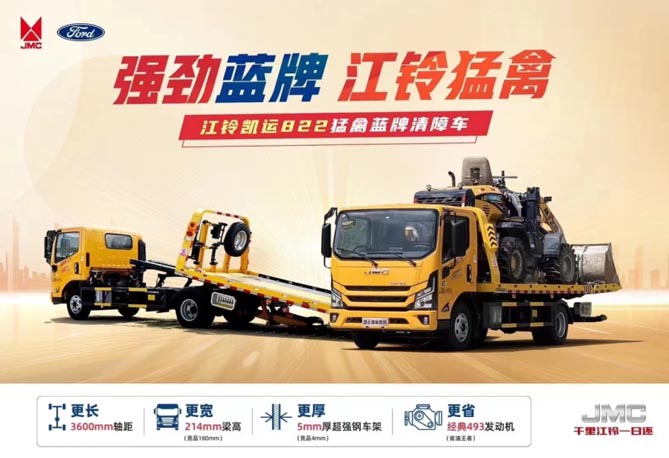 轻卡方面,全新一代凯运清障车涵盖多项科技创新,双副梁 40KN液压绞盘、双侧联动操作装置,轻松升举,性能可靠,反复测试,无惧碾压。1900mm宽体驾驶室设置,也大大拓宽了车辆的驾乘舒适性和储物便利性,最终以安全高效、省油舒适为突出优势,蓝牌首选!