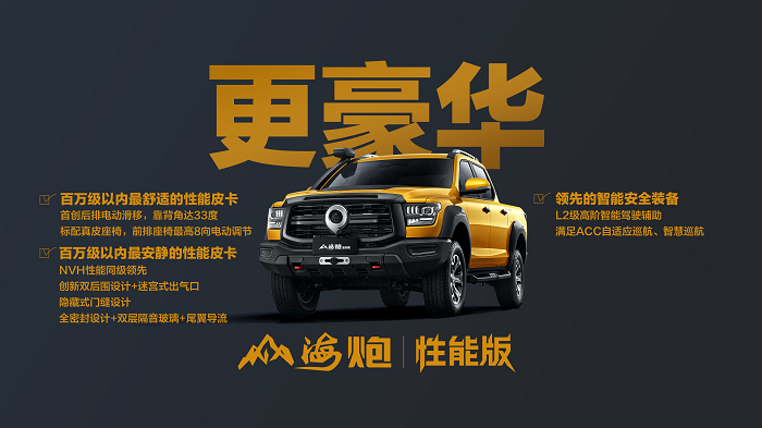 11月17日,大型高性能豪华皮卡——山海炮性能版广州车展正式上市,官方指导价27.98万元,并为用户带来万元置换、4年不限次数全路况救援、山海居5折购买权益等7重大礼!