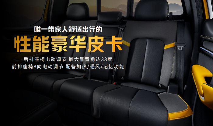 山海炮性能版车长达5.46米、车宽近2米,接近全尺寸级别。得益于缩短后悬、增加轴距、加宽轮距、优化避震布置等设计,驾乘空间更宽敞,为同级最大,车内肘部宽度达到1.6米,带来头等舱般的空间感受。配合皮卡首创后排座椅电动调节,以及同级领先的静音设计,一路上带来极致舒适的驾乘体验。参与试驾的媒体纷纷表示,山海炮性能版后排宽大、安静,乘坐感受超越同价位SUV。