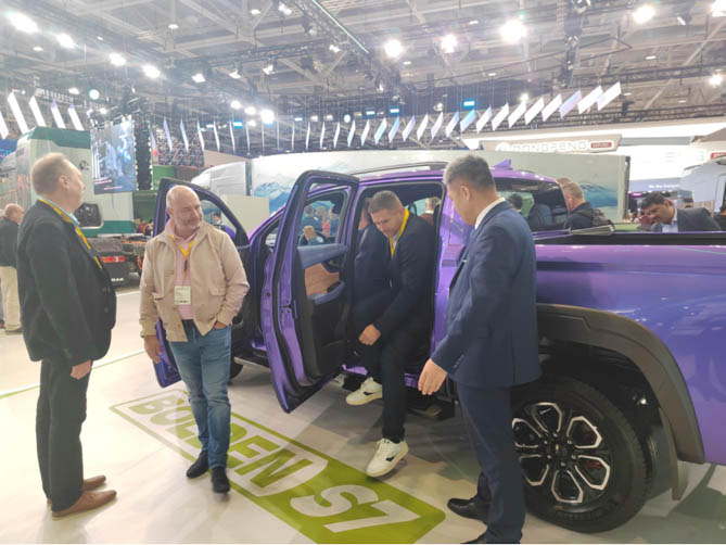 德国是传统的老牌汽车强国,也是全球高端汽车品牌的大本营,为凸显豪华感与稳重感,车身的美学设计多秉承稳健内敛的设计理念,在颜色的选择上也以深色为主。为了给海外客户耳目一新的感觉,本次参展的搏胜S9和搏胜S7车身颜色分别采用了极具东方特色、靓丽夺目的丛林翠和霞光紫,在一众以黑色和白色为主的展车里自成一道风景线。新奇特别的配色吸引了众多海外客户的目光,丛林翠配色的搏胜S9赢得中老年客户、户外活动爱好者等客户群体的好评,而霞光紫配色的搏胜S7则颇受年轻客户,尤其是女性客户欢迎,有客户评价其“第一眼就让人心动不已,与传统的汽车相比颜色非常引人注目。”在欣赏外观之余,不少客户进入座舱内试乘,对搏胜皮卡内饰的豪华精致与乘坐舒适性也接连赞叹。