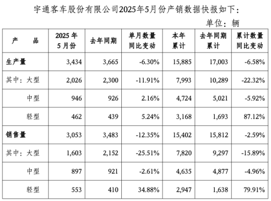 具体来看,2025年5月份,宇通大型客车销量为1603辆,中型客车销量为897辆,轻型客车销量为553辆(同比增长34.88%);1-5月份,宇通大型客车累计销量为7820辆,中型客车累计销量为4635辆,轻型客车累计销量为2947辆(同比增长79.91%)。