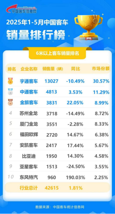 2025年前5月,宇通客车在6米以上客车市场持续保持领跑态势,累计销量达13027辆,以30.57%的市场份额稳居行业第一。尤为突出的是,其销量规模已超过行业第二、第三、第四名企业的销量总和,形成极具说服力的领先优势。这既是宇通品牌综合实力的印证,更是用户对其产品价值高度认可的生动注脚。