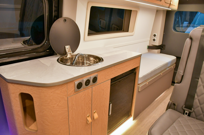 先锋官V宿营车深谙野外生存法则——水电充足才是真自由!其配备48V 200AH锂电池、48V 6KW高频逆变充电一体机、12V水泵、100L清水箱等设备,洗漱烹饪随心用,彻底告别“省着用”的焦虑。车身采用保温隔热材料,配备48V驻车空调、柴暖系统、42L冰箱、热水器等一系列生活电器,共同构建全天候舒适座舱,无畏寒暑变迁。外置淋浴花洒、不锈钢洗菜池等配置让户外生活变得像在家一样方便,给予用户满满安全感。