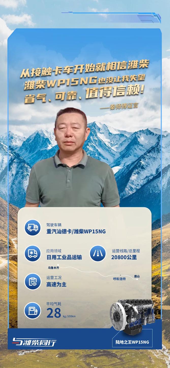 对秦师傅来说,潍柴是他的可靠“伙伴”,更是省钱的法宝。WP15NG百公里气耗较同功率产品低2kg,目前他跑这条路单程的平均气耗约28kg/100km。