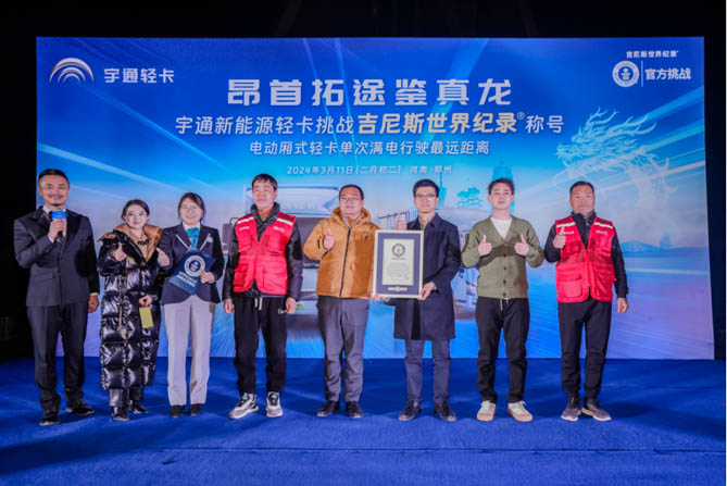 【宇通新能源轻卡获得“电动厢式轻卡单次满电行驶最远距离”的吉尼斯世界纪录称号】