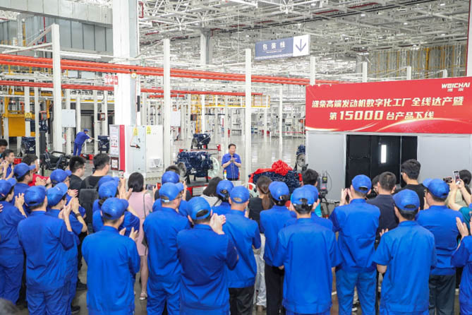 “潍柴智能数字化工厂全线达产,第15000台下线!”随着潍柴集团董事长谭旭光的一声号令,一台披红挂彩的WP7H发动机在潍柴员工热烈的掌声中走下生产线,即将发往整车客户。
