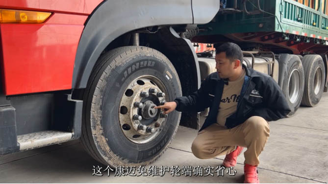 “以前总担心轮端的保养,跑个几万公里就得拆轮、涂黄油来保养,费钱是一方面,还影响我送货的时效。现在好了,康迈让我体验到了上路无忧。”区别于传统脂润滑轮端,采用油润滑技术的康迈免维护轮端,加注或更换油液时,只需通过端盖上的注油孔便可自行完成,无需拆卸轮端,非常方便,节省大量轮端维养的时间成本
