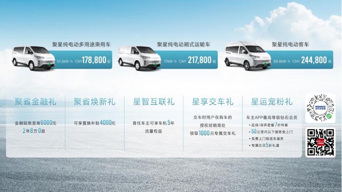 据悉,聚星纯电动多用途乘用车,17.88万元起;聚星纯电动厢式运输车,21.78万元起,聚星纯电动客车,24.48万元起。南京依维柯还为购车用户准备了多重优惠福利,可谓诚意十足。即日起下订依维柯聚星EV系列产品,可尊享包括金融贴息至高6000元、2年8万0息的聚省金融礼;可享4000元置换补贴的聚省焕新礼;首任车主可享车机5年流量权益的星智互联礼;价值千元的星属交车礼和车主APP最高等级钻石会员的星运宠粉礼,感兴趣的车友可以去就近的南京依维柯4S店进行咨询与购车。