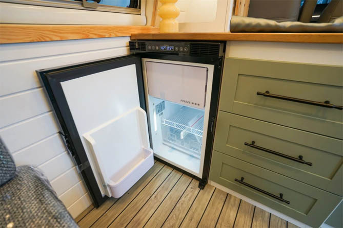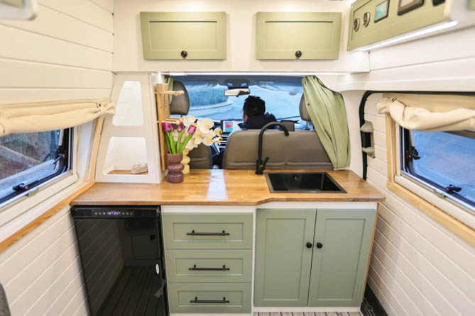 厨房区域一字型组合式橱柜、厨房吊柜、冰箱等设施一应俱全。特别是神仙收纳洞洞板置物架,让车内的储物空间得到了充分利用,让您的物品摆放有序。在这里,您可以轻松烹饪出各种美食,让生鲜蔬果、餐具用品都能得到妥善的收纳和洗涤。无论何时何地,您都能品尝到家的美味。