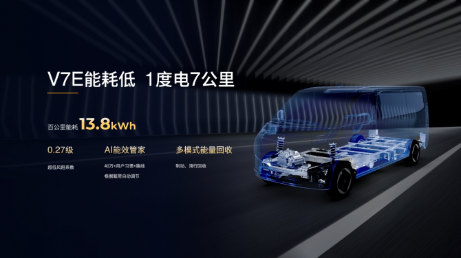 高效节能,续航制胜。新车提供51.4kWh玄武电池,CLTC工况续航375公里,未来还将拓展更大电量玄武电池,满足460公里续航的使用需求。在AI能效管家以及多模式能量回收技术的加持下,星享V7E实现百公里电耗低至13.8kWh,打造同级大电量,超级长续航,轻松覆盖城市配送及短途城际运输市场。