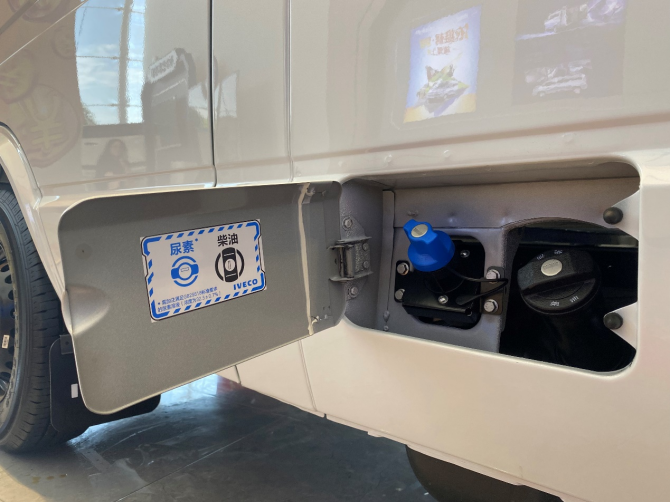 加油口在车辆的左侧,柴油和尿素箱盖用黑色与蓝色加以区分。
