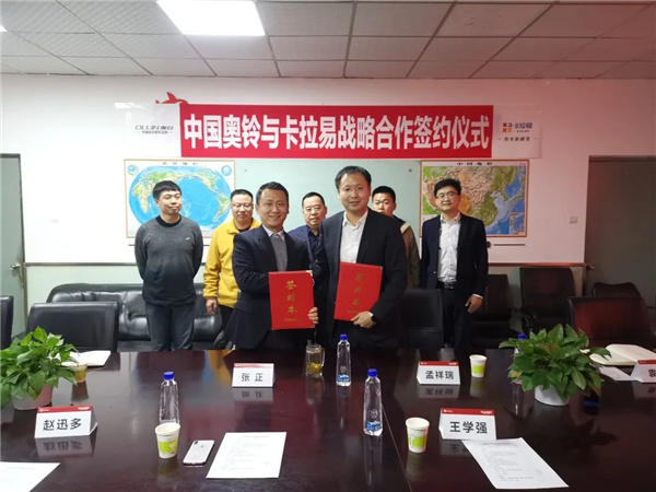 1月29日下午福田奥铃与北京卡拉易网络科技有限公司战略合作签约仪式在北汽福田总部举行,福田奥铃事业部副总裁孟祥瑞、福田奥铃事业部第一副总经理康界炜、奥铃事业部服务总监马建磊、卡拉易创始人CEO张正、卡拉易技术总监赵迅多、卡拉易市场运营副总经理王学强等出席仪式。