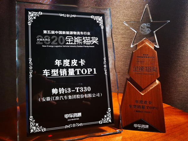 2021年4月15日-16日,第四届中国(成都)新能源汽车产业大会暨第五届中国新能源物流车行业“金熊猫奖”颁奖典礼在成都隆重举行。凭借品牌硬核实力,帅铃i3-T330纯电动皮卡荣膺“金熊猫·年度皮卡车型销量TOP1”大奖,帅铃i5-V330 纯电动冷藏车荣膺“金熊猫·年度冷藏车推荐车型”大奖。