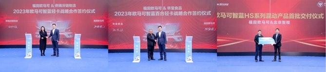 得益于强大产品力的加持及超值的政策,欧马可智蓝HS系列混动产品一经上市即赢得用户的高度认可,上市即热销。活动现场,欧马可智蓝不仅与湖南供销冷链物流、华宝食品签署战略合作协议,达成战略合作,更向北京智程交付了2023年度百台订单的首批车辆。