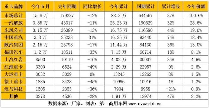 随着各类利好大政策的陆续消退,重卡行业开始迎来降速发展期。各主要卡车制造企业五月份都进入了负增长时代。