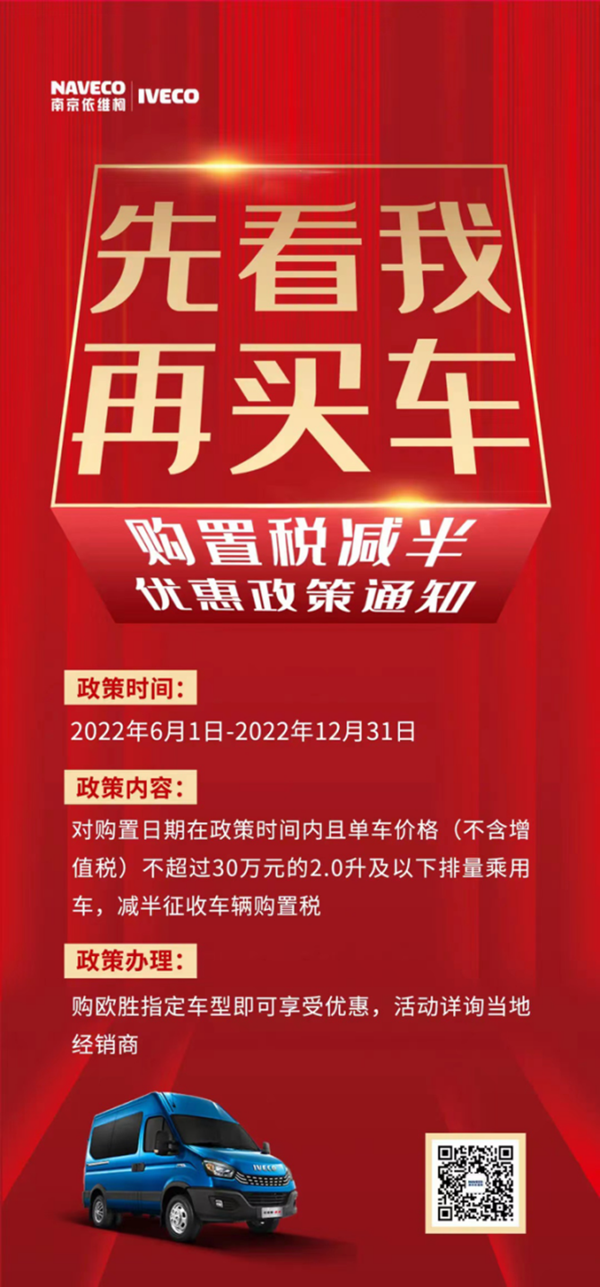 本次公告涉及车辆范围广,减征力度大,一部分轻客车型也涵盖在内,如我国知名商用车制造企业南京依维柯旗下依维柯欧胜超瑞系列,就同样享受车辆购置税征收减半政策,购车成本降低近5%,南京依维柯也同步推出6月大促活动,为用户带来超值购车福利,可享换车补贴、金融贴息以及金融礼、置换礼、保险礼等超惠福利,对用户而言,这无疑是个非常重大的利好消息。