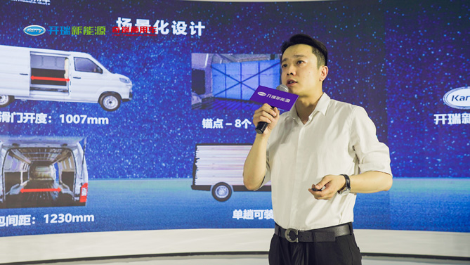 最后,开瑞江豚项目总监李元良对2023款江豚进行了详细的产品解读。产品不仅有着同级别最优的车身宽度、侧滑门宽度及1230mm的轮包间距,而且还拥有“大空间+多功能+大承载”的优势,载货空间达6.6m³,8个货厢锚点,5个侧壁货架安装孔,可实现货厢空间定制。在承载力方面,2023款江豚采用15寸大轮毂同级最高,可靠耐用,载重质量最大提升超过4%,含规载重最大增加近44kg。
