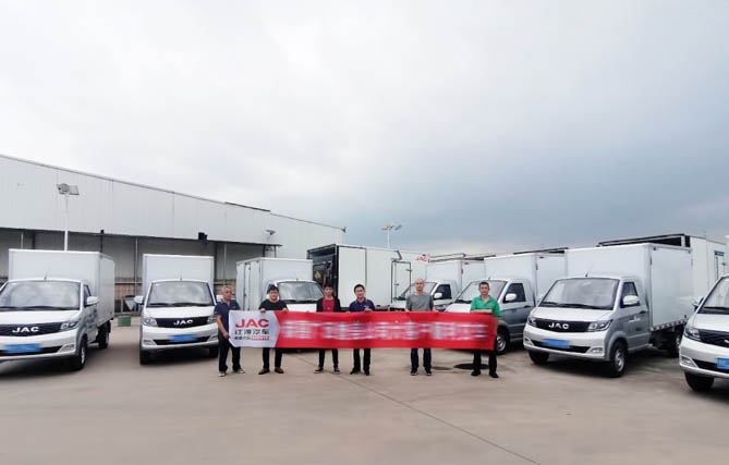 在广西玉林,江淮1卡康铃向某城配运输公司批量交付一批康铃小卡厢车。城配运输面临着道路狭窄、配送点分散等挑战,康铃小卡厢车凭借车身灵活的特点,在玉林的大街小巷穿梭自如。