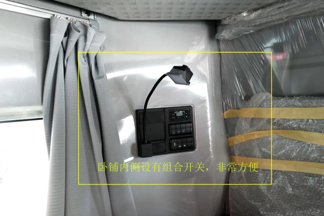 黄河X7驾驶室空间比较大,上下卧铺非常宽,最宽处为900mm,卧铺的一侧组合开关,可控制双侧门窗、天窗、灯光和收音机等设备,自带可折叠小台灯和USB充电口。