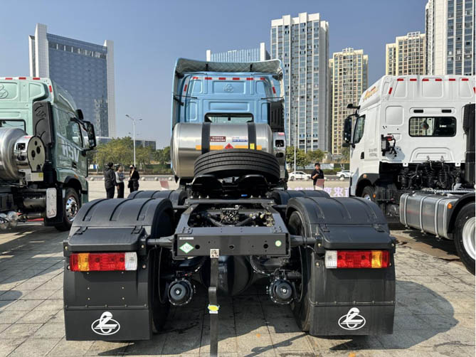该车标配1500L容量LNG气罐,可选配2x1350L的双气瓶组合,总容量可达2700L,充分满足长途运输需求。同时,发动机最低比气耗低至179g/kW·h,配合风阻优化与低滚阻轮胎,百公里气耗较同类产品低2kg,年运营成本降低超2万元。