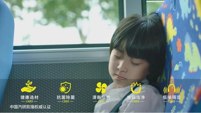 在2020年5月,宇通校车率先通过校车“健康座舱”5A级认证。从健康选材、抗菌除菌、清新空气、电磁洁净和低噪隔音五大维度防护,全方位呵护学童健康。