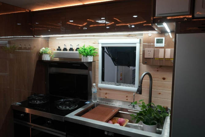 根据配置不同,车辆内饰配置也有着较大的变化。实拍配置为最顶配的旗舰版,配备了室内集成式燃气灶、集成洗碗机、多功能调料架、超大水槽、抽拉水龙头等配置。虽然是一台房车,但依旧带来了家一般的温馨体验。