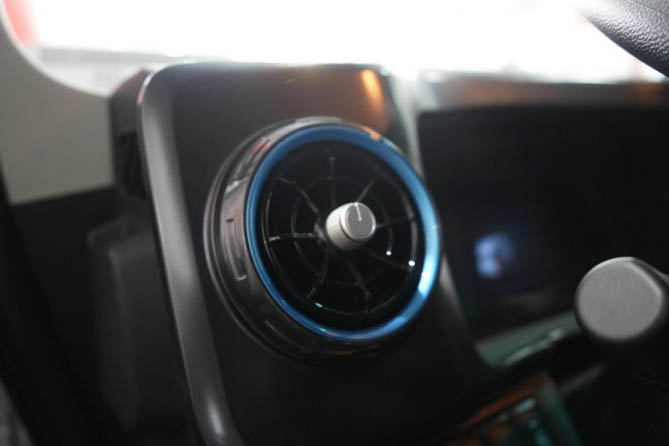 车内出风口均采用了飞机涡轮风扇引擎的样式,高端、精致,出风口外侧还采用蓝色饰条包裹。