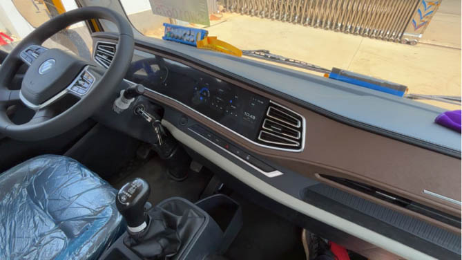 在当下商用车行业普遍追求智能化的背景下,整车的交互体验做得相当到位,10.25寸液晶仪表+多媒体大屏的双联屏设计,提升了驾驶舱的科技氛围和信息集成度。其中液晶仪表可显示车辆状态、保养提示及故障诊断信息,便于驾驶员即时掌握车辆工况。智能语音控制系统可操作空调、多媒体等,减少了驾驶员在行车过程中的手动操作,有助于提升行车安全性。