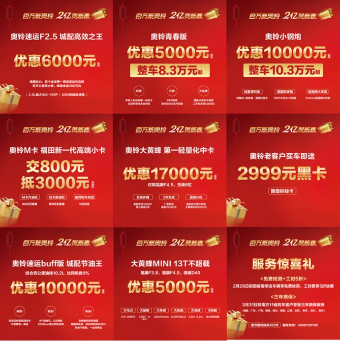 产品好才能卖的好。开年以来,奥铃全系产品的持续热销,证明了其在卡友心目中的地位。而为了进一步回馈卡友,冲刺下一个百万销量目标,奥铃也开启了“百万新奥铃 2亿贺新春”优惠活动,活动截止到3月31日,涵盖奥铃速运、奥铃M卡、奥铃大黄蜂等7款车型,单台车最高优惠17000元!并有服务惊喜礼,部分用户可享免费检测,工时费5折优惠,南方11省(详见图)购车用户还可享受3年质保服务!对于奥铃北方区域老客户,买车还能获得价值2999元的黑卡!