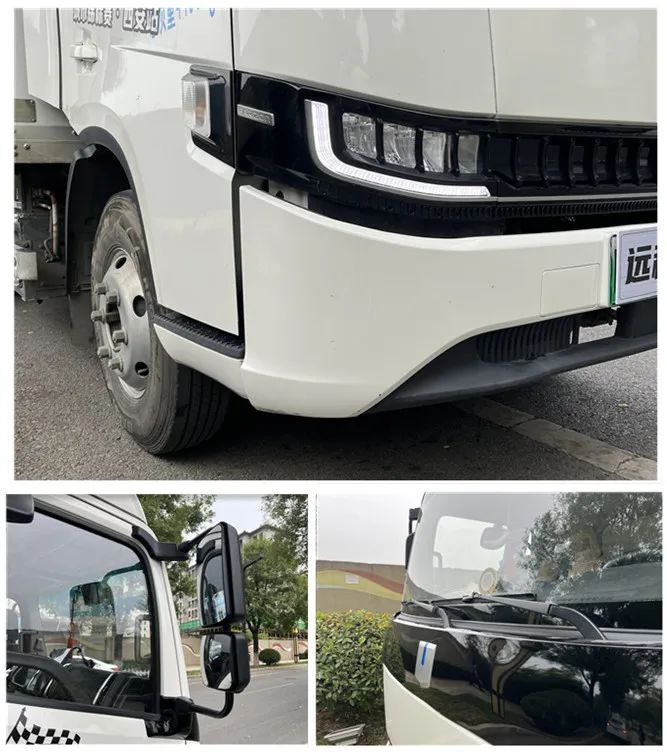 驾驶室采用BOX造型设计,提升形象的同时让卡友赚钱更有面子。一体式导流罩与货箱高度基本保持一致,导流罩延伸至车身侧面,大幅减少车辆在行驶过程中的风阻,风阻优化降低20%,提高车辆续航能力。另外,门把手去黑框,采用轿车化轮眉,简洁又不失优雅。