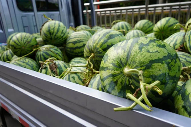 “今年我们镇种了几千亩,亩产八千斤左右。”吴师傅说,他们镇种植的美都西瓜口感好,远近闻名,也是当地村民致富的核心产业。眼下,正值西瓜大批量上市的时节,销售便是重中之重。“这整车瓜是我昨晚从家里采摘的,连夜跑了180公里送到的。”吴师傅说,平日里他和老婆得花4天左右才能卖完,而今天有了康铃公司的直播助农活动,不一会儿就卖了一大半,太感谢了!