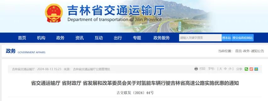 省交通运输厅 省财政厅 省发展和改革委员会关于对氢能车辆行驶吉林省高速公路实施优惠的通知各高速公路经营管理单位: